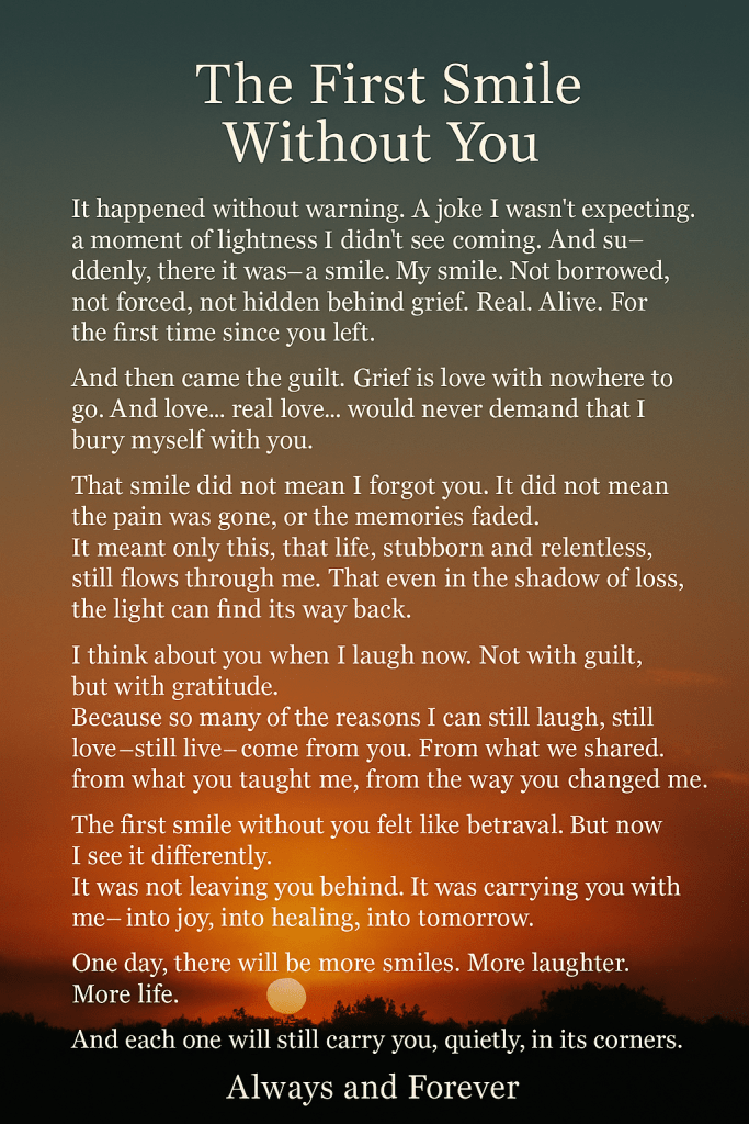 A joke I wasn’t expecting, a moment of lightness I didn’t see coming. And suddenly, there it was — a smile. My smile. Not borrowed, not forced, not hidden behind grief. Real. Alive. For the first time since you left.