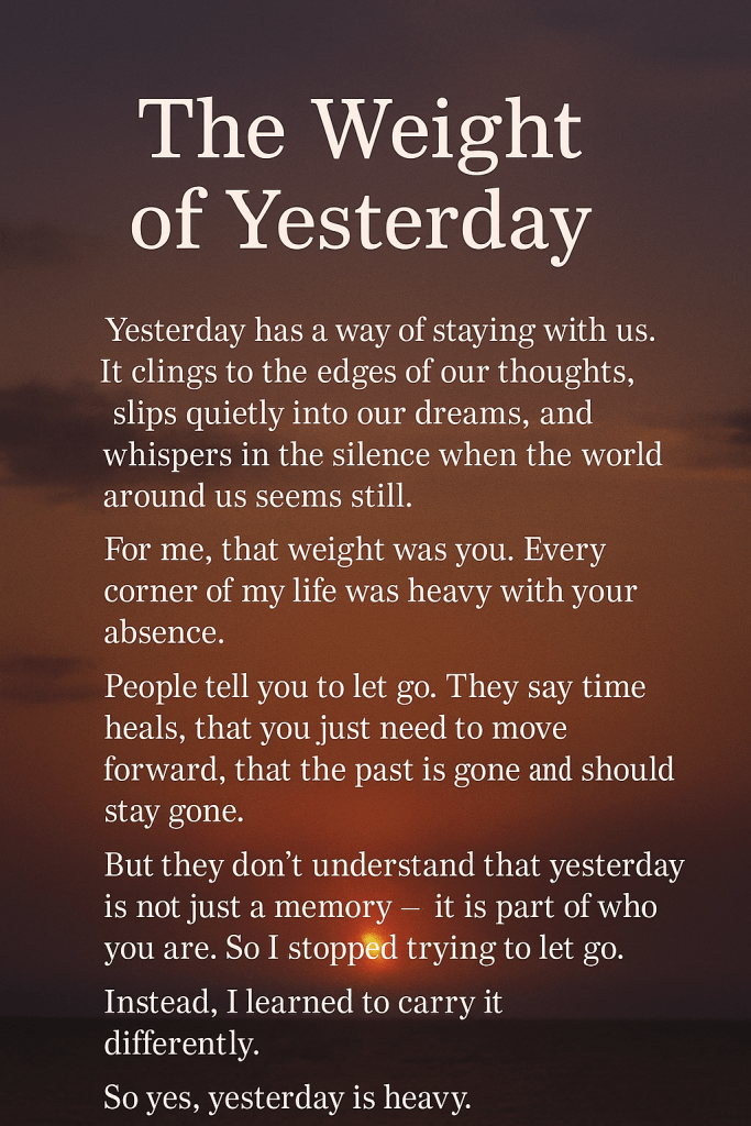 The weight of yesterday is not always destruction. Sometimes it is the anchor that reminds you where you came from, the proof that you once lived, once loved, once risked your heart enough to be broken. It is heavy, yes, but it is also real. And reality, even painful, is better than emptiness.